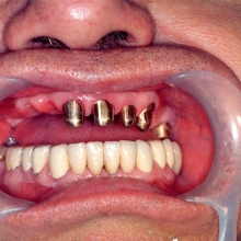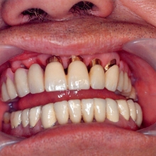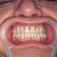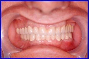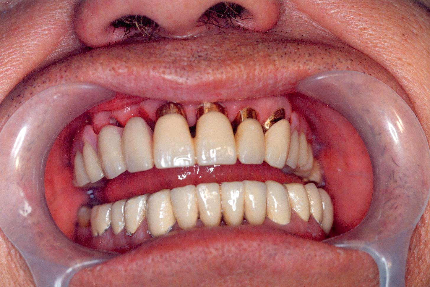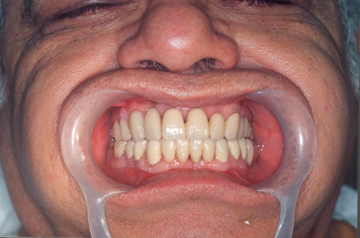 - אחרי: לאחר שיקום מורכב הכולל הרמת מנשך, טיפול בשיניים קיימות, השתלות, ושיקום באמצעות כתרי חרסינה. שיקום שכזה מצריך שימוש בסד לילה באופן קבוע. תוצאה אסתטית ותפקודית מעבר למצופה