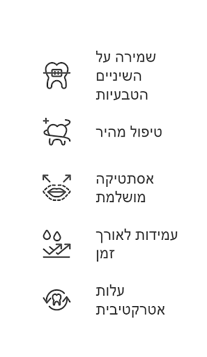 - שמירה על השיניים הטבעיות: בניגוד לגשרים מסורתיים, גשר מרילנד אינו דורש השחזה משמעותית של השיניים הסמוכות.