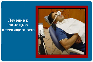 Использование “веселящего газа” (это смесь двух газов: окиси азота и кислорода, которые даются пациенту одновременно). Газ подается через небольшую маску, которая накладывается на нос. Газ дается во время лечения для облегчения состояния пациента