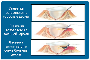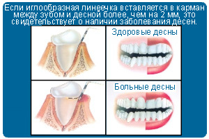 Если иглообразная линеечка вставляется в карман между зубом и десной более, чем на 2 мм, это свидетельствует о наличии заболевания десен.